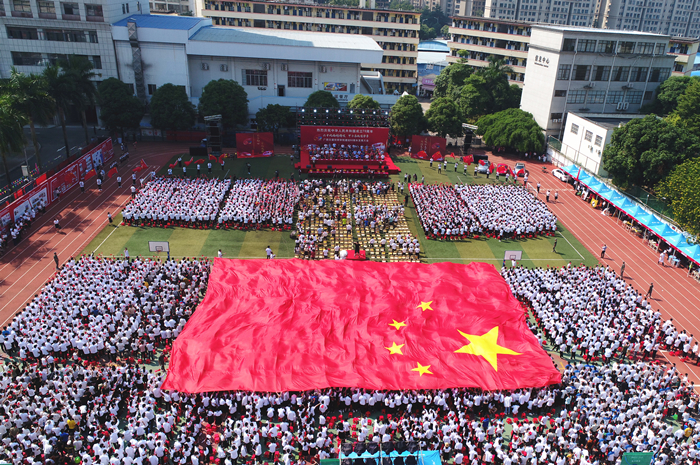 首届全国文明校园——广西交通技师学院校园里展开了一面600平方米的巨幅国旗,